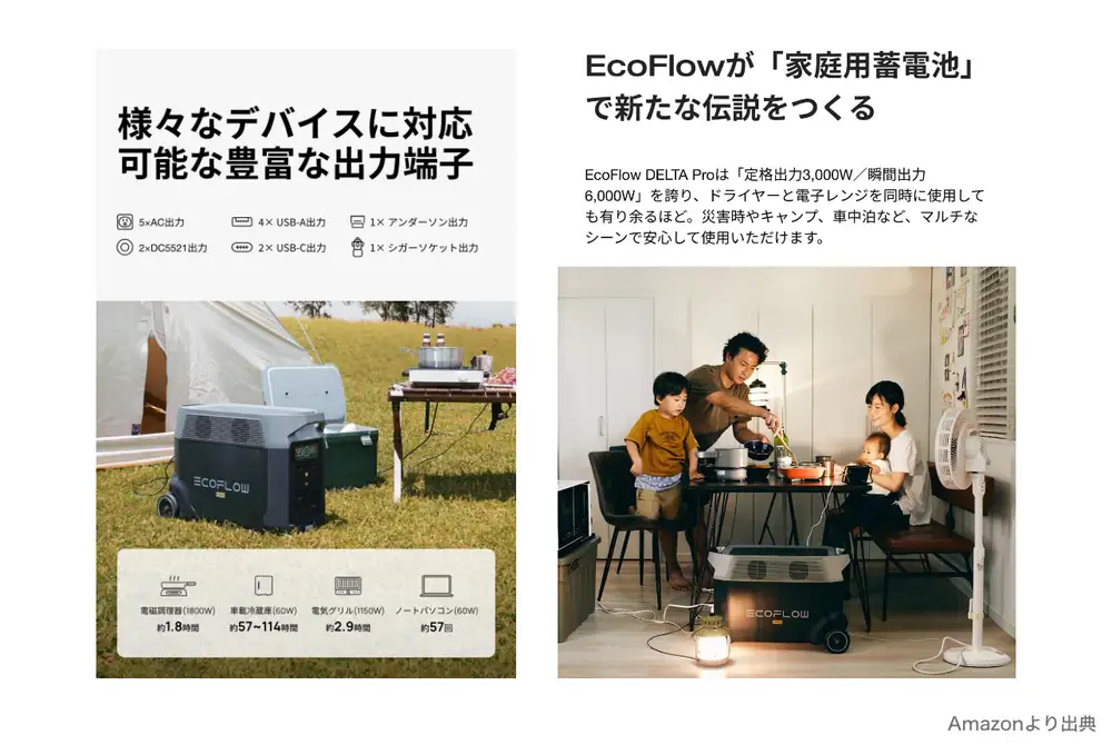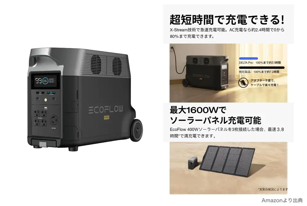 ポータブルバッテリーは、アウトドアやキャンプでの利用だけでなく、災害時に非常に役立つアイテムです。停電や通信手段が断たれた際に、スマートフォンやタブレット、ラジオなどの電子機器を充電するための電源として活躍します。これにより、家族や友人との連絡��維��したり、最新の災害情報を取得することが可能です。その中でも、キャンジョのおすすめはエコフロー社のバッテリー。充電速度が早い。またソーラーパネルも併せて購入することをお勧めします。停電時はポータブルバッテリーの充電ができません。自宅の日の当たるところにパネルを設置すれば、電気が使えます。災害時に使う、ではなく日頃からポータブルバッテリーを使うことに慣れておくことをお勧めします。
