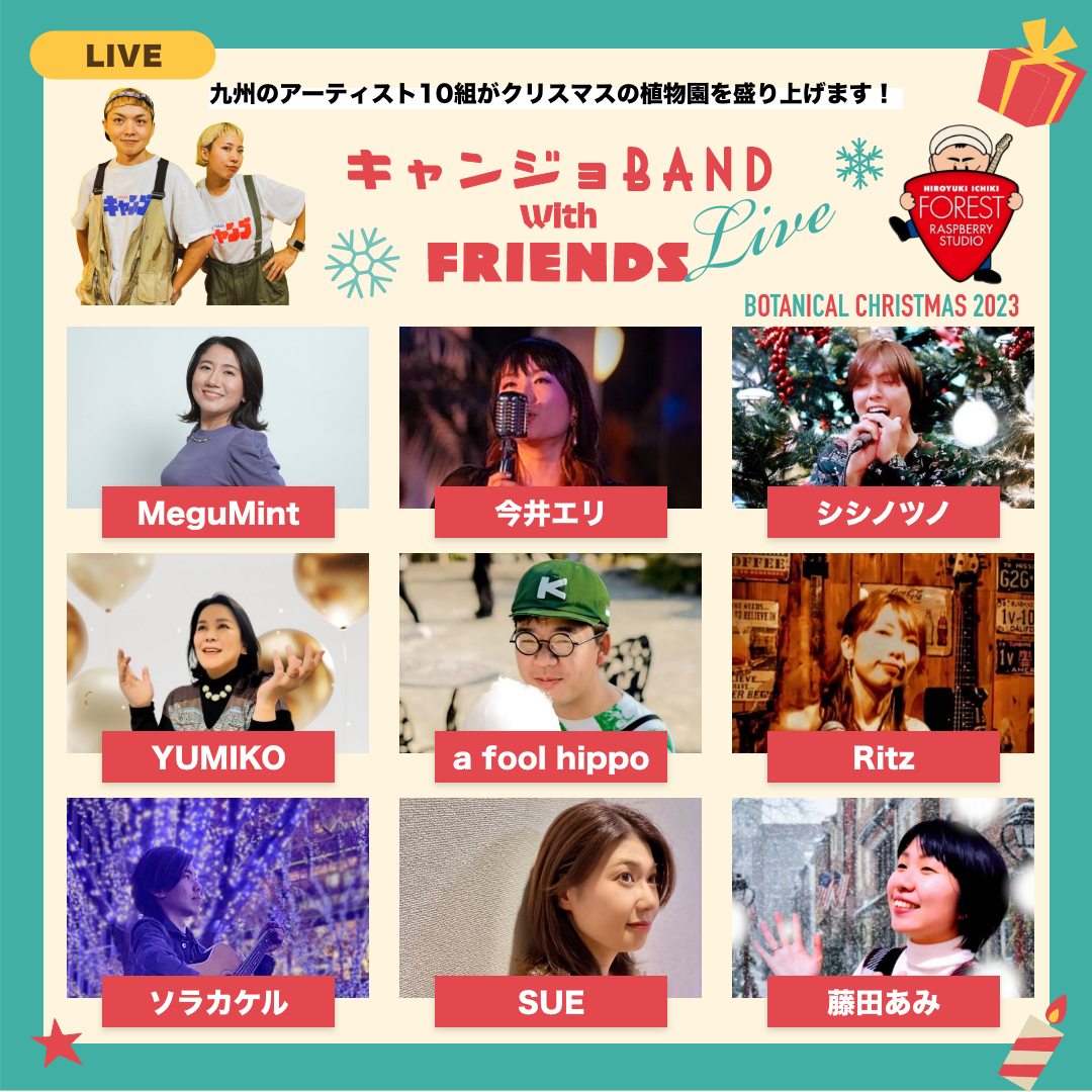 今回は、キャンジョバンドと愉快な仲間たち、キャンジョバンドwith FRIENDSのみんなによるクリスマスソングの⽣ライブや、親⼦で楽しめる⼈気謎解き「アルクエスト」の開催、そしてなんと!福岡市植物園より、園内の売店・レストランで使える600円分のクリスマスプレゼントクーポンをプレゼントしま す。