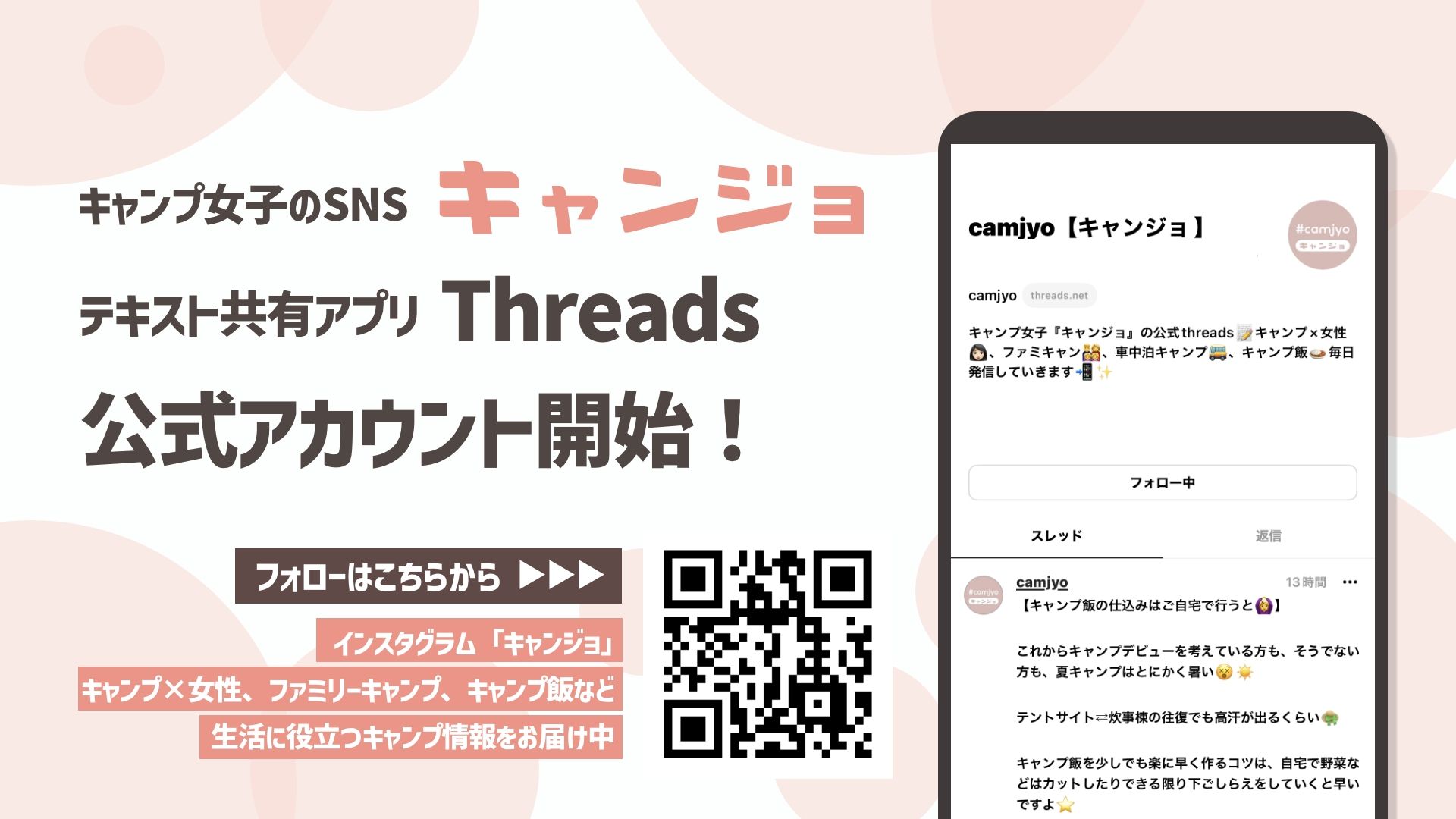 キャンプ女子株式会社(本社:福岡市、代表:橋本華恋)は、よりスピーディーにキャンプの魅力を発信するため、Instagramアカウント@camjyoをThreadsアカウントとして新たに開始しました。これにより、より一層身近な形でキャンプの素晴らしさをお届けします!